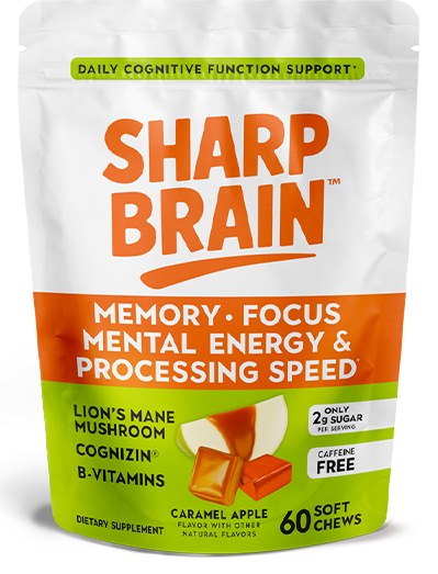 Sharp Brain is a delicious daily cognitive support chew that supports memory, focus, mental energy, and processing speed. With clinically studied Cognizin® Citicoline, organic Lion’s Mane, and essential B-vitamins in a rich caramel apple soft chew, it offers a more enjoyable, stimulant-free way to support everyday brain performance.